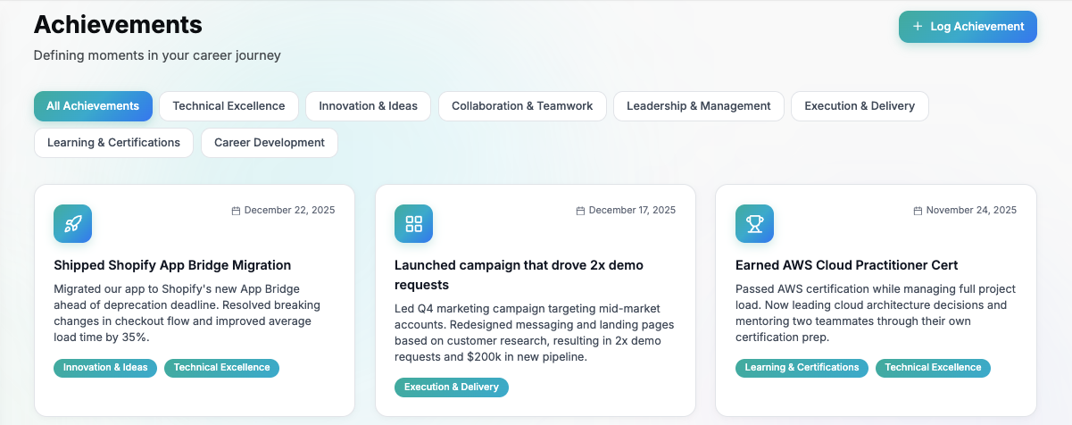 Plan with goals, capture achievements, and let AI build your career story—ready for reviews, promos, interviews, and 1:1s.
